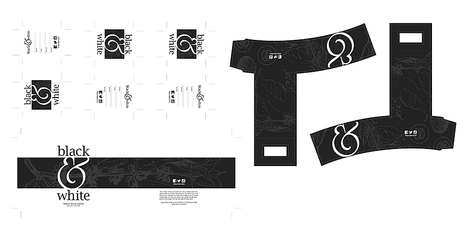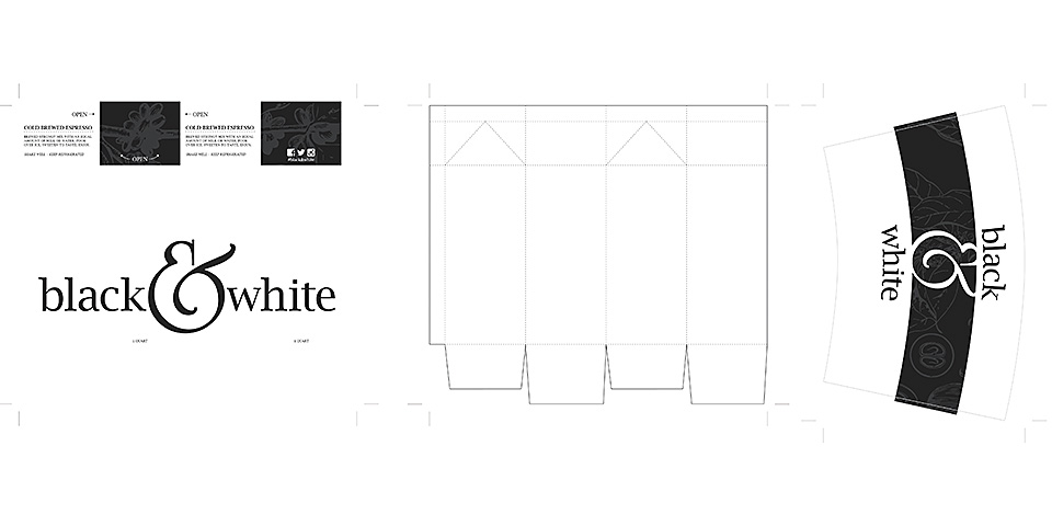 Black & White was conceptualized as a minimalist coffee brand with packaging that embodies a “no-frills” ethos, focusing purely on quality coffee. Extensive research and sketching helped shape the idea of using clean lines and a restrained color palette for a streamlined packaging suite, where every side of each package element was thoughtfully designed to showcase simplicity. A custom hybrid sleeve-carrier was also developed, combining a thermal sleeve with a dual-cup carrier for easy transport, aiming to reduce waste and enhance functionality.