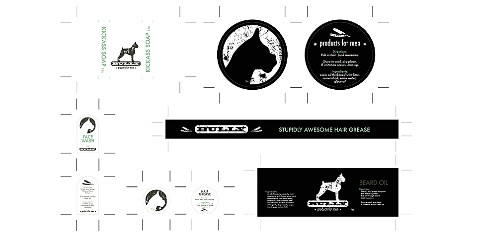 Embodying the energy of old-school barber shops and classic Americana, Bully’s “super awesome hair grease” and “kick-ass soap” embrace raw, unapologetic style. This design celebrates resilience and strength, creating a brand that’s more than grooming—it’s a lifestyle for those who value substance with a bit of grit.